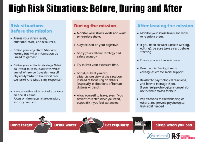 Emotional stress can divide a journalist’s attention while on the field and thus negatively impact their work. This article, based on infographics from online medical consultation service provider Eutelmed, explains how journalists can effectively manage their emotional health during a mission.