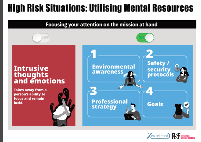 Emotional stress can divide a journalist’s attention while on the field and thus negatively impact their work. This article, based on infographics from online medical consultation service provider Eutelmed, explains how journalists can effectively manage their emotional health during a mission.